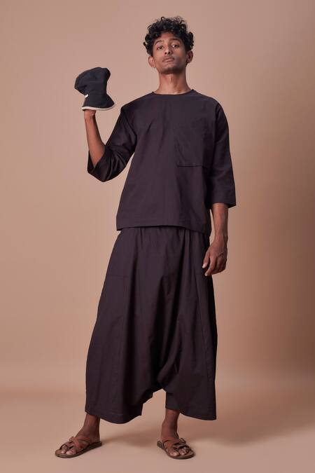 Black handwoven T-shirt with oversize patch pocket & round neckline. Paired with harem pant.