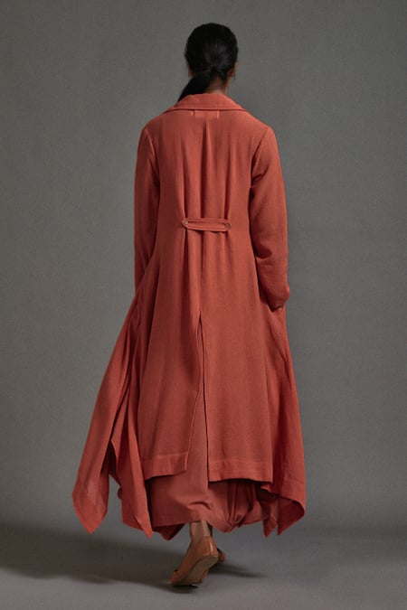 Rust orange longline jacket in textured cotton fabric featuring a lapel collar and long sleeves