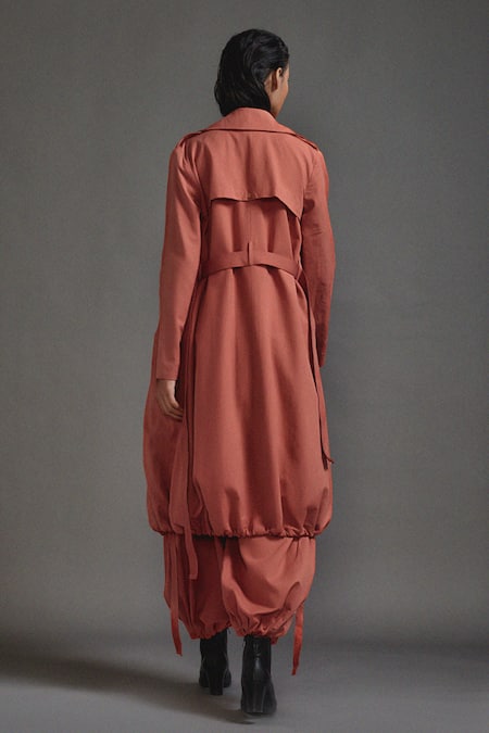 Rust orange longline jacket in textured cotton fabric featuring a lapel collar and long sleeves. Comes with a matching belt and safari pockets for added utility.