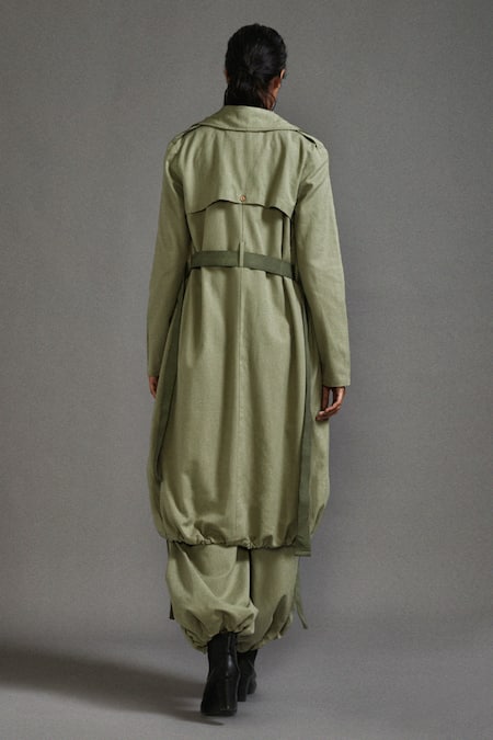 Green Cotton Collared Oversized Trench Jacket With Belt