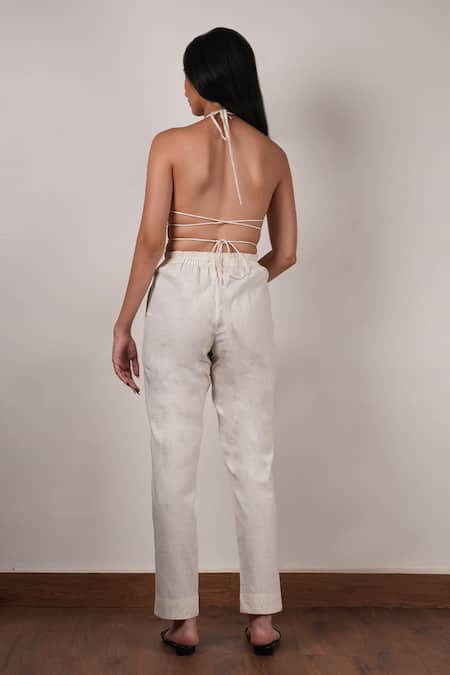 Off white halter neck bralette featuring waist tie drawstrings. Paired with matching straight pant.