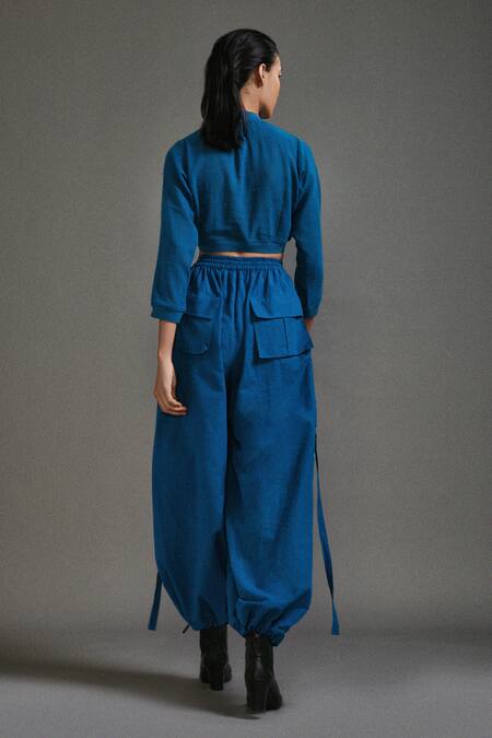 Blue Cotton High Neck Ribbed Waist Crop Top With Baggy Cargo Pant