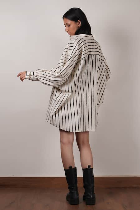 Off-white shirt featuring an all-over stripe pattern made from cotton. Paired with a scallop hem bralette and coordinating shorts.