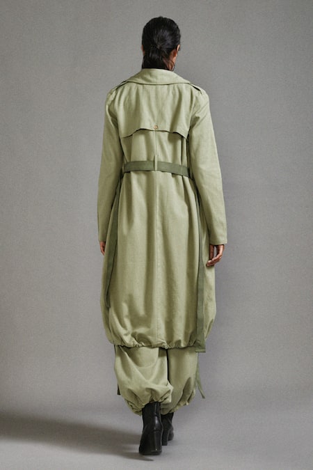 Buy_MATI_Green Cotton Collared, Open Neck Trench Coat Cargo Pant Set _at_Aza_Fashions