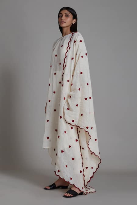 Oatmeal linen kurta with red heart motif embroidery. Comes with linen pant & dupatta.
