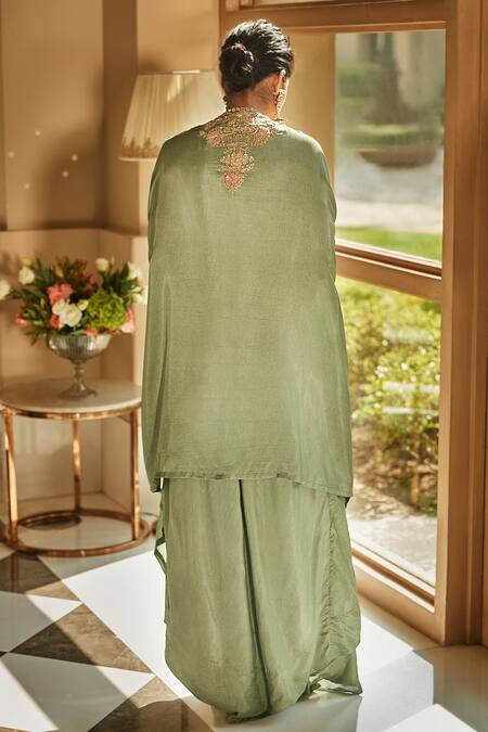 Green Silk Resham Aari Blouse Scoop Aurora Dhoti Set With Cape