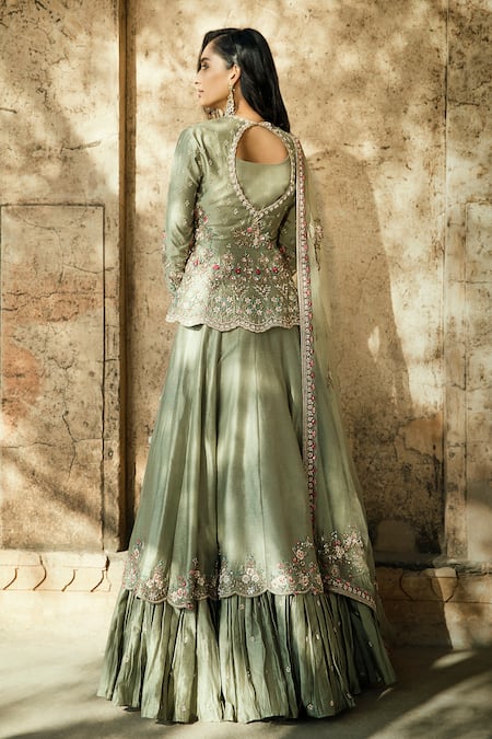 Pista Chanderi silk based pleated lehenga with floral sequins & aari work enhanced with luxurious vintage zardozi work & scallop hem. Paired with floral embroidered peplum blouse, embroidered inner & organza embroidered dupatta.
