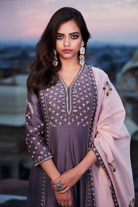 Grey kurta with floral embroidered motifs and sequin work. Comes with straight pants and dupatta.