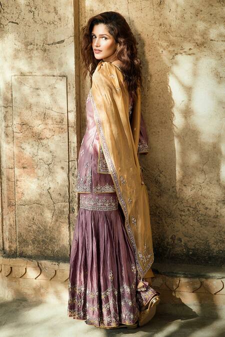 Onion pink kurta with floral sequins, resham thread and zardozi hand embroidery. Paired with embroidered sharara & embroidered contrasting yellow dupatta.