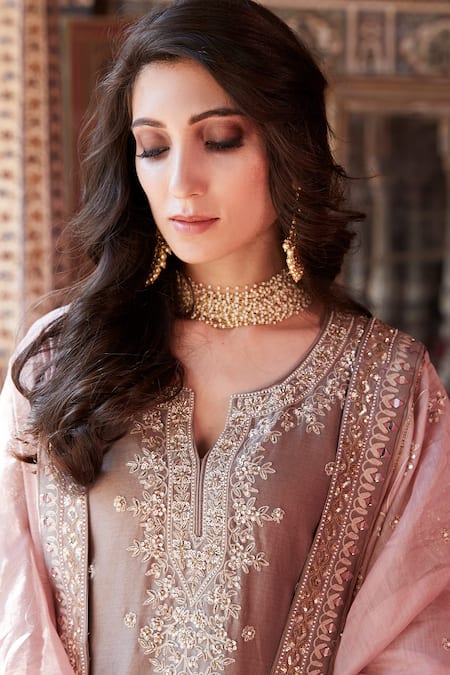 Beige Chanderi Silk Mirror, Pearl And Thread, Sequin Notched Kurta Sharara Set