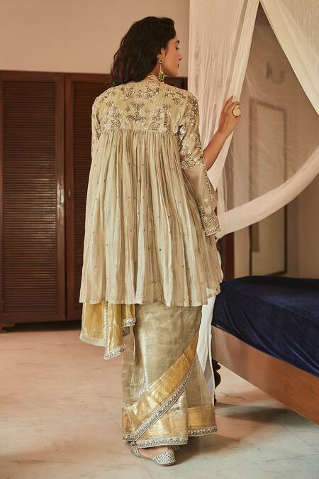 Pleated jacket, Floral motif work, Zari border, Pearl embroidered