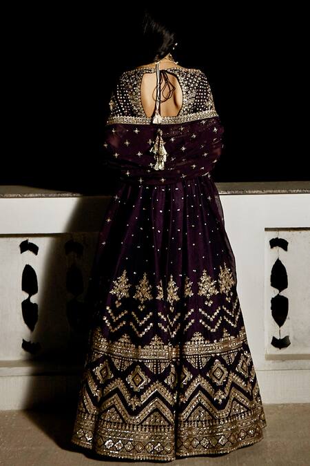 Purple lehenga featuring intricate zari, aari, nakshi pittan, and zardozi embroidery. Paired with an embroidered padded V neck blouse, a georgette organza dupatta, and a potli bag.