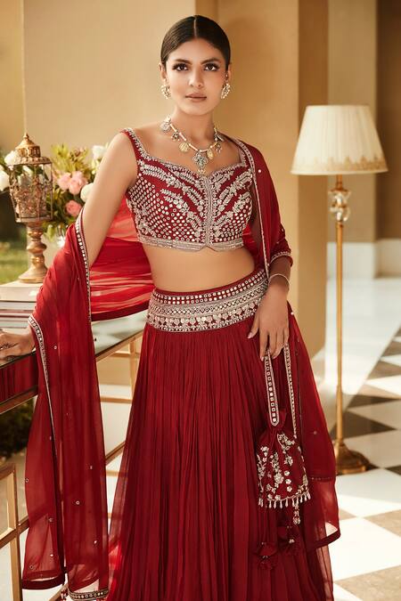 Red lehenga in silk base with gathers on waist, embellished belt & banarasi borders. Paired with blouse with resham thread, mirror work and resham aari embroidery & organza dupatta with mirror work.