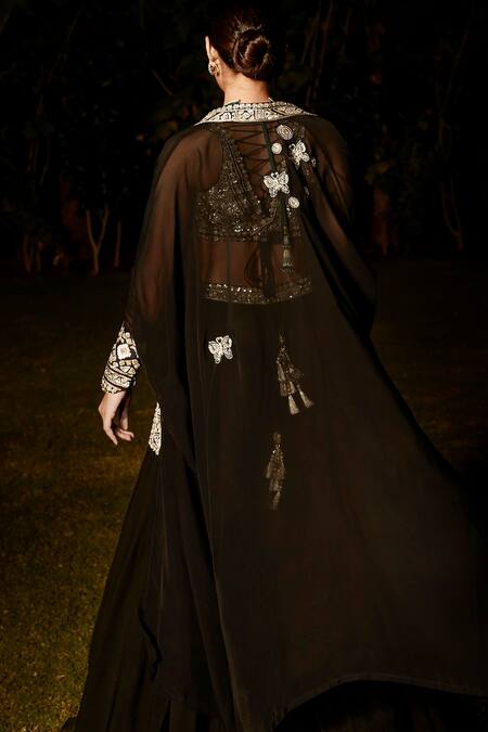 Black Organza, Georgette Embroidery Scoop Neck The Holy Roman Cape And Sharara Set
