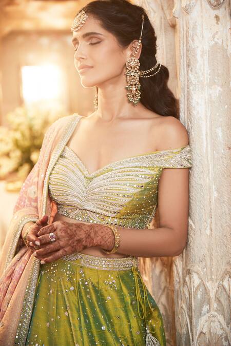 Green-gold two tone silk lehenga with kutchi dori, zardozi & mirror embellishment. Comes with winged blouse and dupatta.