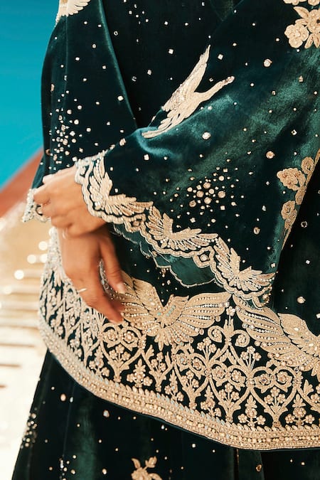 Green Velvet Swarovski, Kachi Dori And The Winged Masai Kurta & Sharara Set