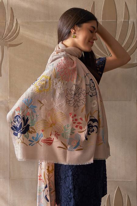 Frayed hems, Blazing bloom pattern embroidery, Lightweight wool-silk blend