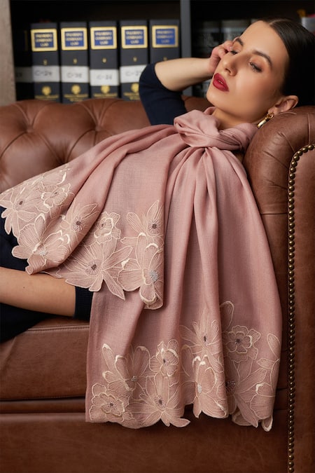 Pale mauve stole featuring magnolia bloom embroidered motifs and a cutwork border