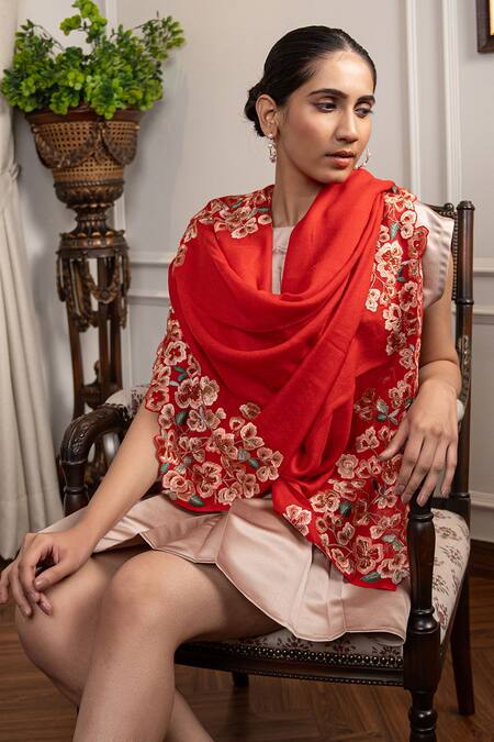 Red stole featuring intricate resham embroidery in a floral pattern