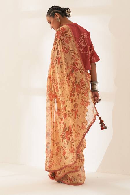 Vaguely tangerine orange pure linen handloom saree featuring all-over floral and bird prints. Paired with a contrast unstitched blouse piece.