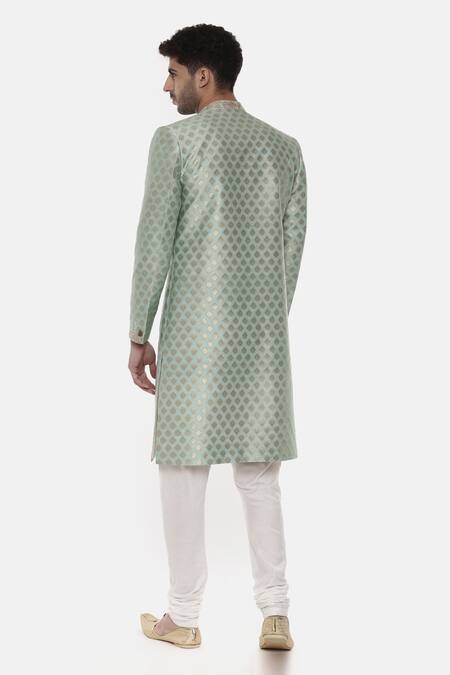 Green sherwani with floral woven motifs, placement embroidery & patch pocket. Comes with churidar.