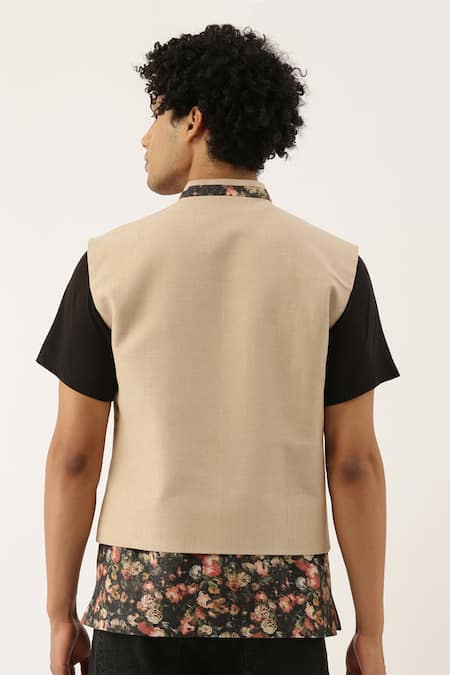 Beige bundi with floral print layered band collar, hem, front placket and patch pockets.