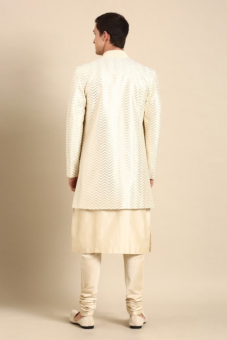 Ivory jacket featuring full sleeves and a high neck design with thread embroidery in a chevron pattern
