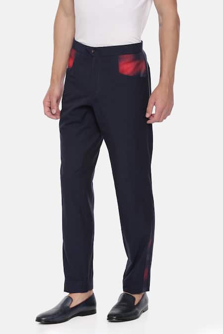 Blue straight-fit cotton trousers with side seam pocket & red checkered patchwork detail.