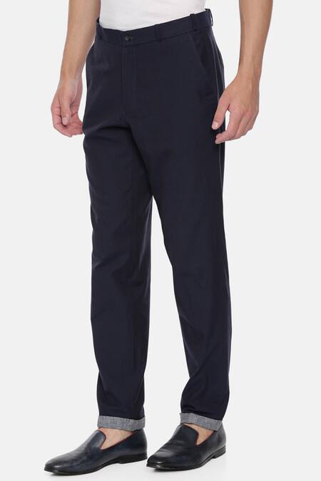 Blue straight-fit cotton trousers with side seam pocket & upturned hemline.