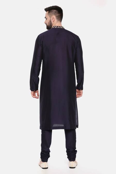 Navy blue kurta featuring leaf embroidery on the placket and stand collar. Paired with a churidar for a complete look.