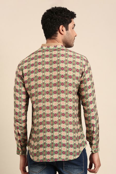 Green Muslin Geometric Floral Print Shirt
