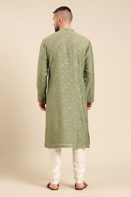 Green silk chanderi kurta featuring thread embroidered floral jaal patterns. Paired with a white churidar with front drawstring closure.