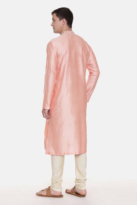 Pink silk cotton kurta with floral embroidery on placket & mandarin collar. Paired with churidar.