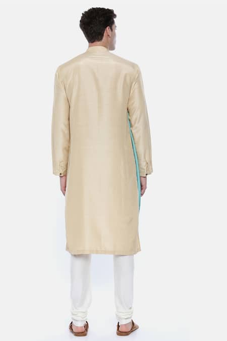 Beige kurta with contrast asymmetric drape. Paired with churidar.