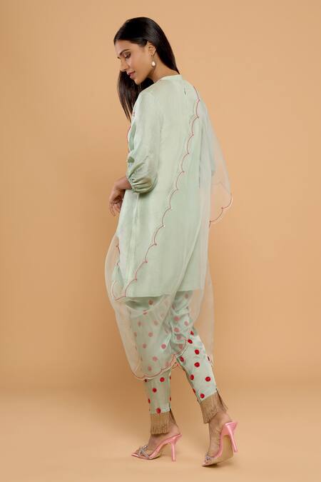 Sea green patiala pant featuring hand embroidered polka dots and tassel fringed hem