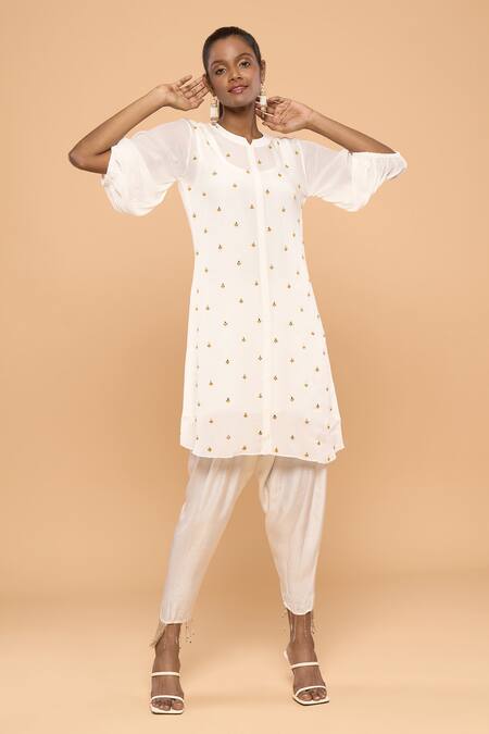 White patiala pant featuring hand embroidered jute tassels at the hem