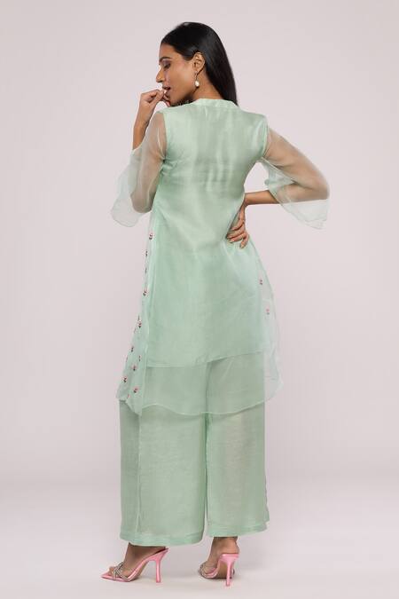 Sea green layered kurta featuring hand-embroidered roses and bell sleeves. Paired with elasticated palazzo pants for a coordinated look.