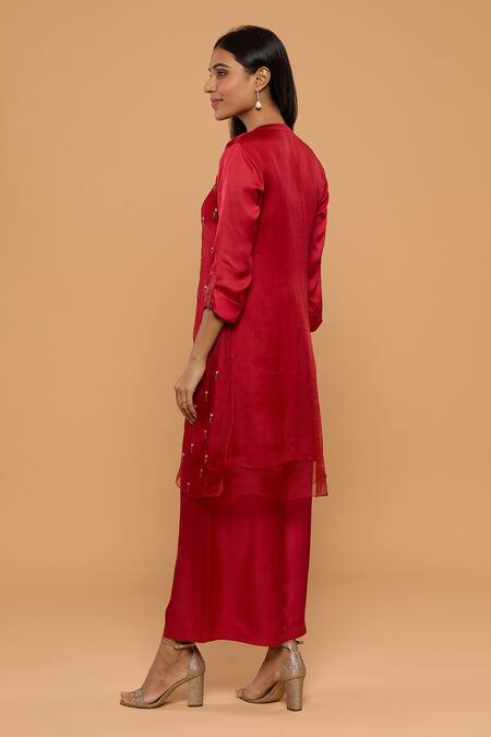 Red Organza With Shantoon Hand Embroidered Roses Layered Kurta