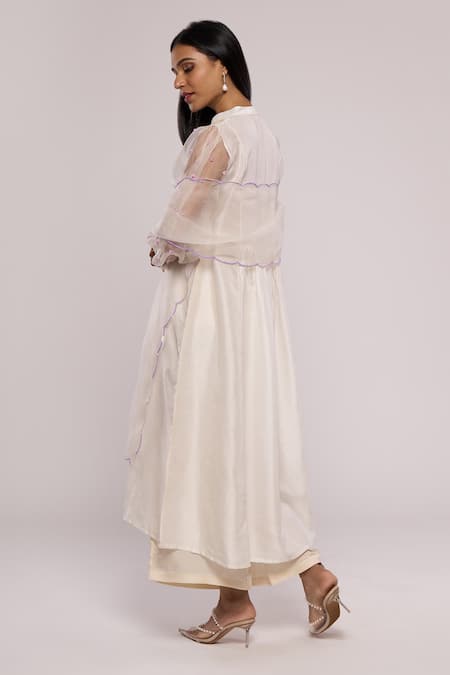 White Silk, Organza Embroidery Bandeau Neck Yoke Flared Kurta