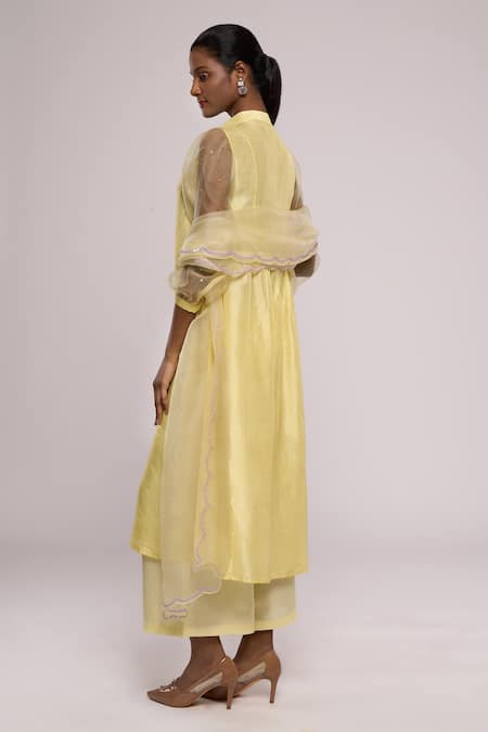 Yellow Silk, Organza Embroidery Bandeau Neck Yoke Floral Kurta