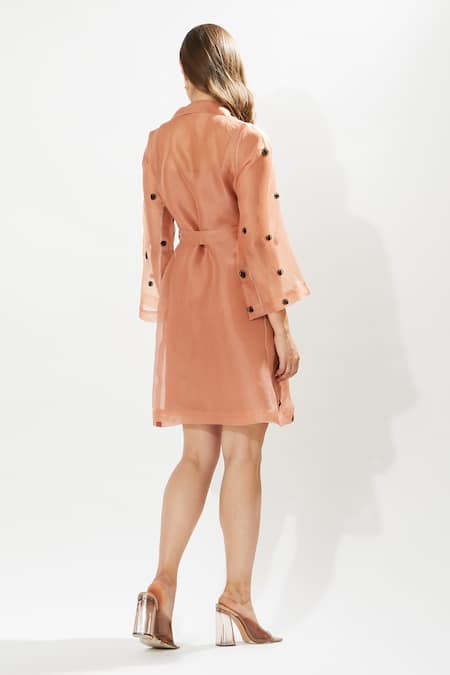 Coral Silk Organza Embroidery Collared Gaia Coat With Inner Dress
