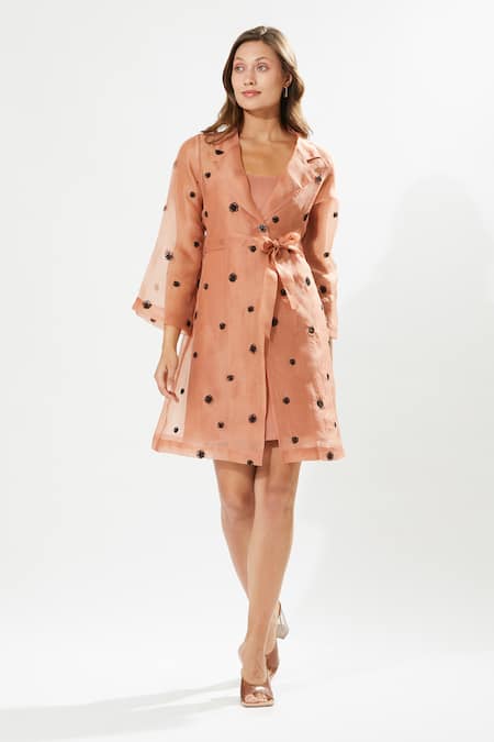 Coral Silk Organza Embroidery Collared Gaia Jacket