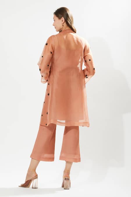 Coral tunic featuring floral embroidery with a lapel collar and full sleeves. Paired with matching silk cotton organza pants and inner lining.