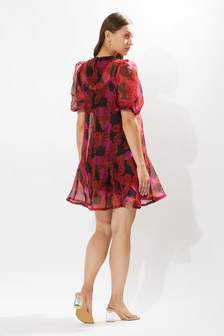 Black flared dress featuring an all-over rosa print and puff sleeves. Paired with a cotton voile inner slip.