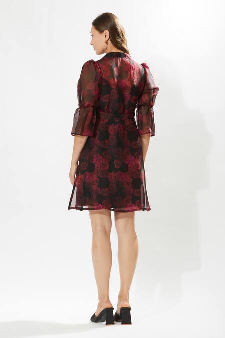 Black and red jacket featuring an all-over rosa print, poet sleeves, and a notched lapel collar