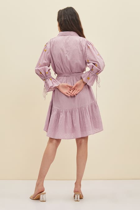 Lilac ruffled dress with floral embroidery, tie-up detail & frill sleeves. Comes with belt.