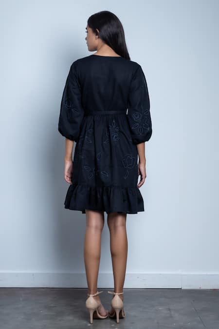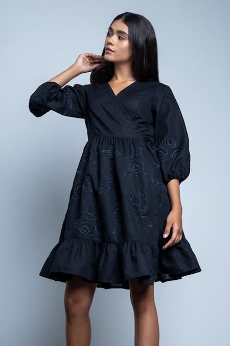 Black wrap dress with floral applique embroidery & frilled hem.