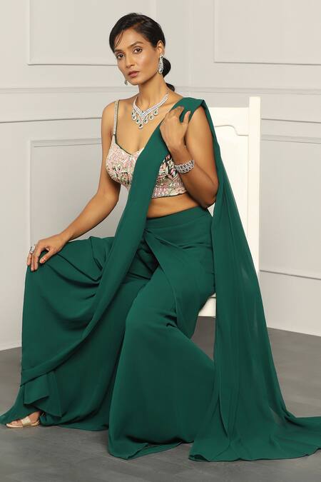 Emerald green draped sharara saree featuring a pre-pleated pallu. Paired with a floral embroidered padded blouse adorned with resham, mirror, and cutdana work.