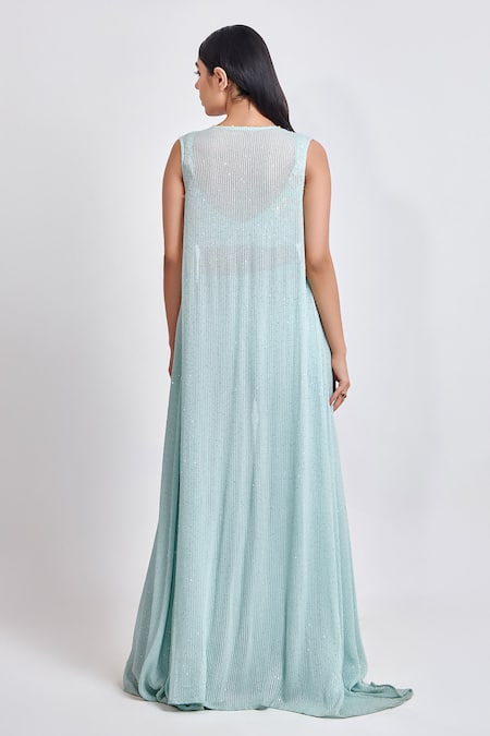 Blue georgette cape embellished with crystals on edges. Paired with a padded choli featuring resham work and sequin embroidery, alongside a sharara with a zipper closure.