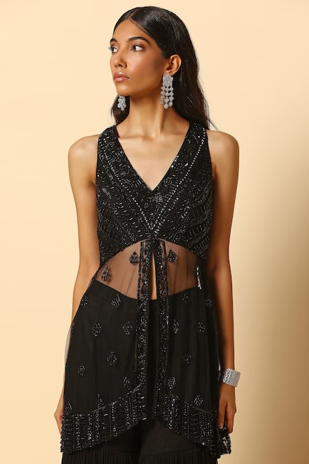 Black peplum top in viscose georgette featuring V neckline and silver stones embroidery. Paired with a matching sharara with attached lining.